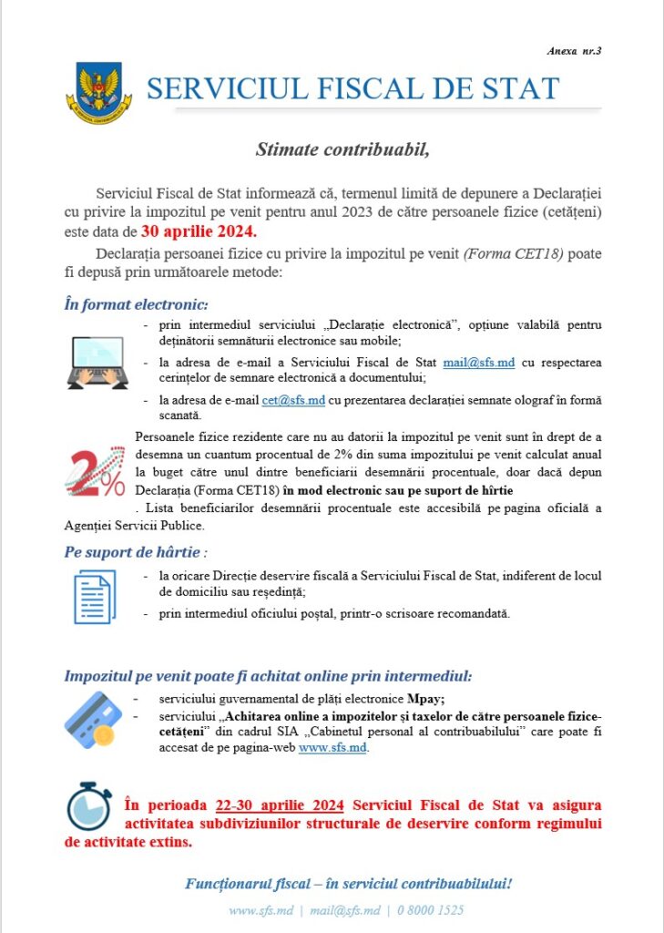 La data de 04 aprilie 2024, începând cu orele 0900 și până la 1500, în incinta Primăriei Măgdăcești, se va desfășura procesul de recepționare a Declarațiilor cu privire la impozitul pe venit pentru anul 2023 obținut de persoanele fizice (cetățeni).
