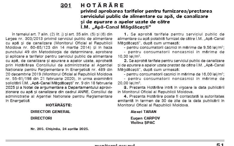 Agenศia Naศionalฤ pentru Reglementare รฎn Energeticฤ (ANRE) a aprobat noile tarife pentru serviciile publice de alimentare cu apฤ ศi canalizare prestate de I.M. โApฤ-Canal Mฤgdฤceศtiโ. Astfel, ๐๐๐๐๐๐๐๐๐๐๐๐ ๐๐๐๐๐๐๐ vor plฤti ๐,๐๐ ๐ฅ๐๐ข/๐ฆยณ ๐ฉ๐๐ง๐ญ๐ซ๐ฎ ๐๐ฉ๐ฬ ศi ๐๐.๐๐ ๐ฅ๐๐ข/๐ฆยณ ๐ฉ๐๐ง๐ญ๐ซ๐ฎ ๐๐๐ง๐๐ฅ๐ข๐ณ๐๐ซ๐, รฎn timp ce ๐๐๐๐๐ฬฆ๐๐ ๐๐๐๐๐๐๐๐๐ vor achita ๐๐,๐๐ ๐ฅ๐๐ข/๐ฆยณ, respectiv ๐๐,๐๐ ๐ฅ๐๐ข/๐ฆยณ.