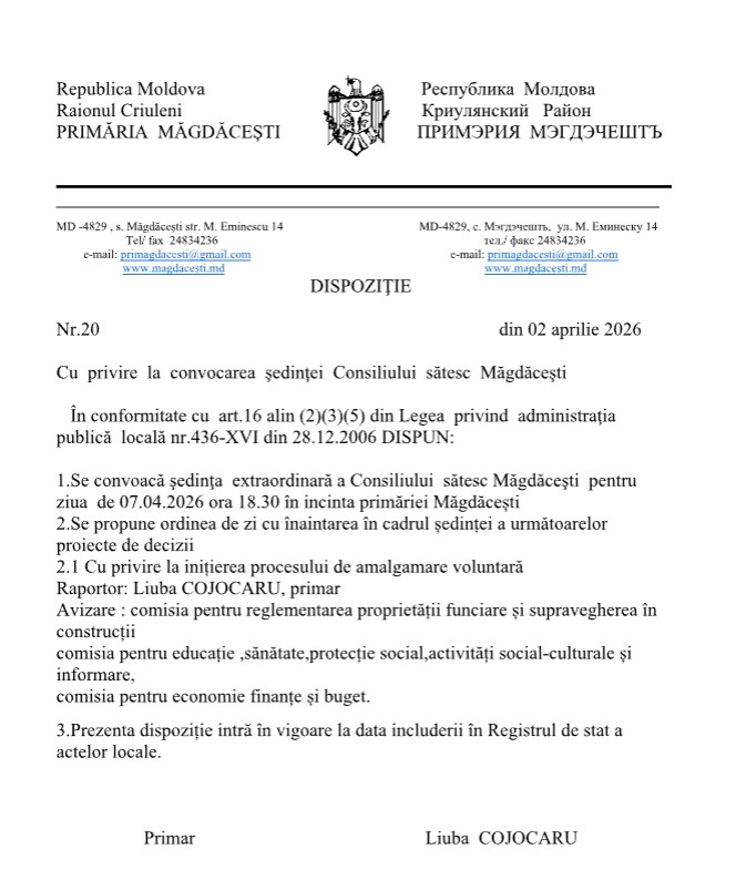 UncategorizedANUNȚ: Ședință extraordinară a Consiliului local Măgdăcești Posted on April 3, 2026April 3, 2026 by Olga Enachi Anunț: consultare publică pentru planul geometric și atribuirea terenurilor